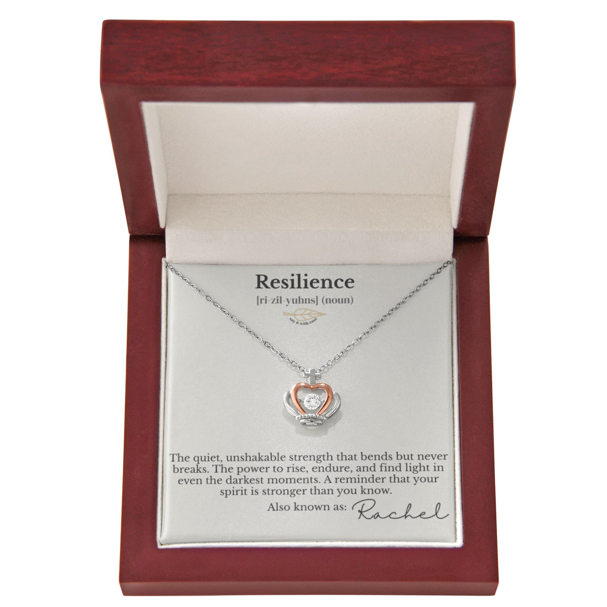 Each necklace pairs a symbolic design with the definition message card, allowing her to choose the style that best reflects her story.