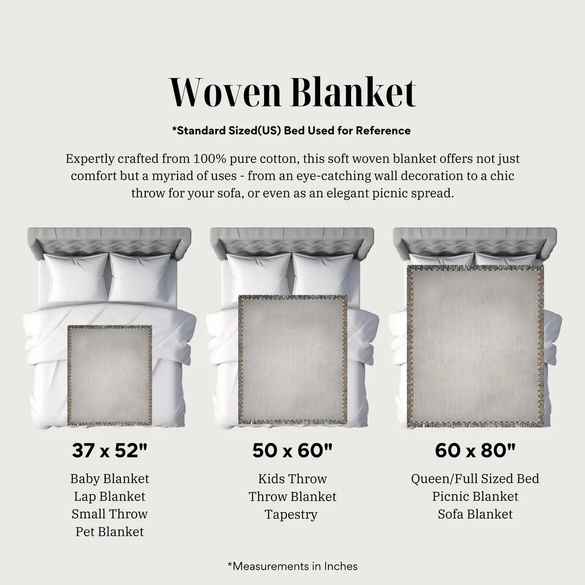 Your blanket will be custom-made upon order. You can expect a vibrantly and professionally woven design, making this a piece that can be treasured for a lifetime.