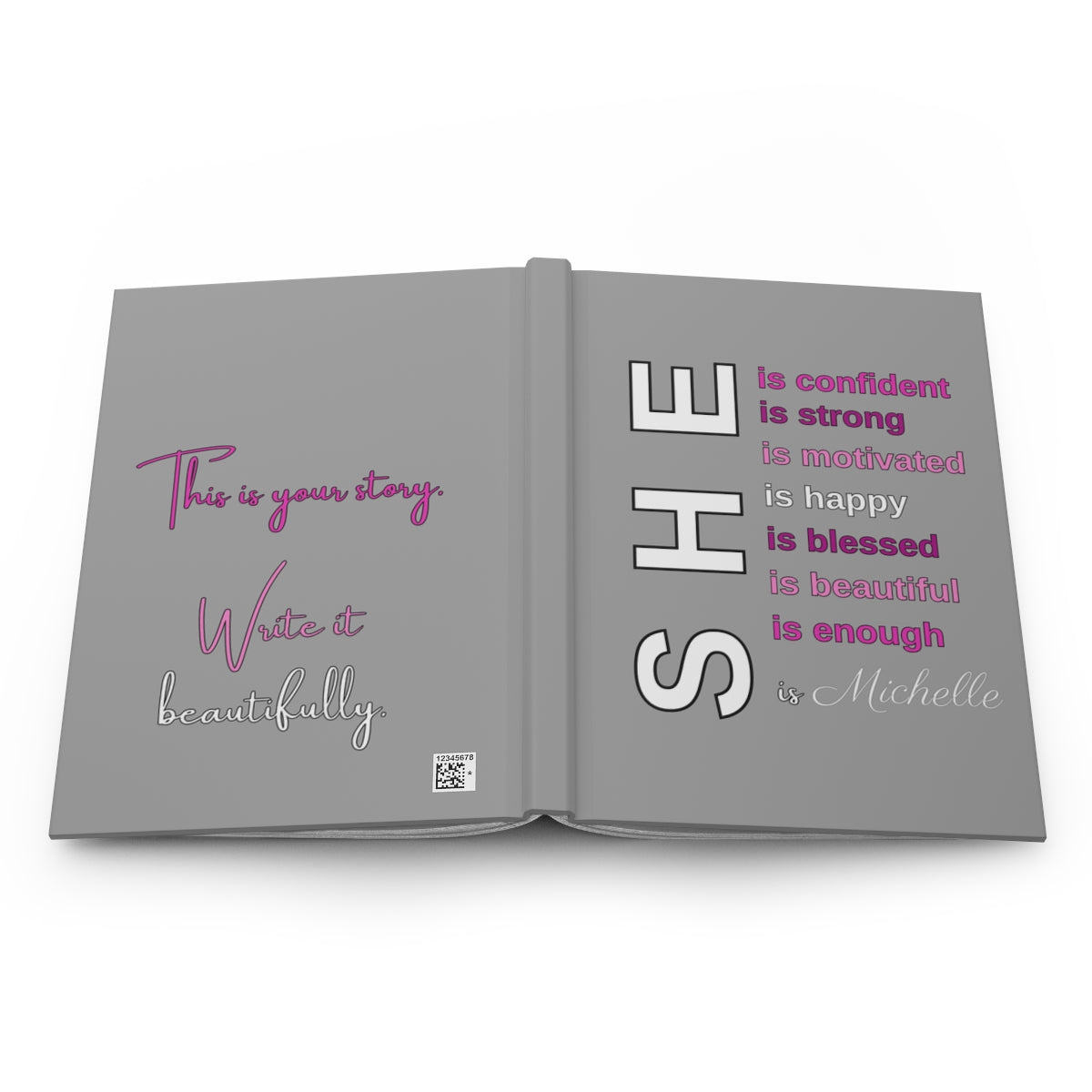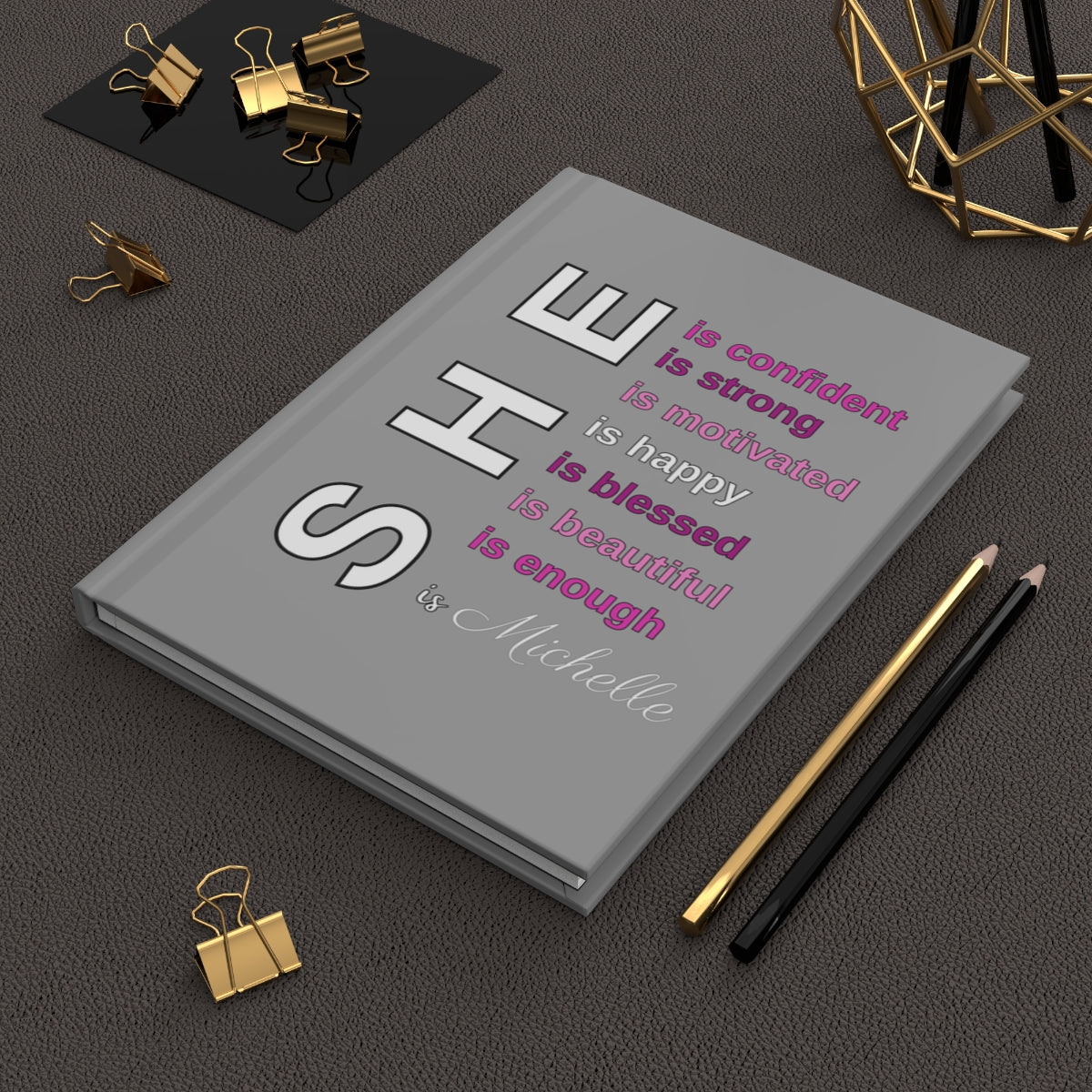 This beautifully designed journal is a daily reminder of your inner strength and beauty. With an empowering front cover that reads: She is confident, is strong, is motivated, is blessed, is happy, is beautiful, is enough, this journal is perfect for capturing your thoughts, goals, and dreams. Personalize it with your name to make it uniquely yours.