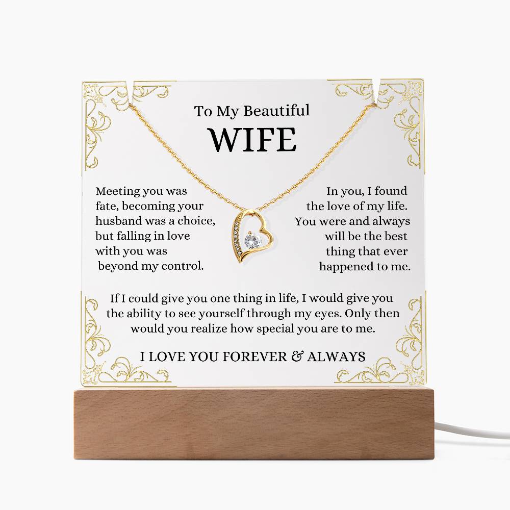 Celebrate your love and admiration for your wife with our elegant keepsake Premium Acrylic Plaque & Necklace Bundle. This set features a beautifully crafted Square Acrylic Plaque showcasing a heartfelt, personalized message on crystal-clear acrylic—perfect for adding a meaningful touch to any space. Paired with the stunning Forever Love Necklace, this bundle makes the ultimate gift for anniversaries, birthdays, or any special occasion where you want to make a lasting impression. This timeless, thoughtful gesture shows her how much she means to you.